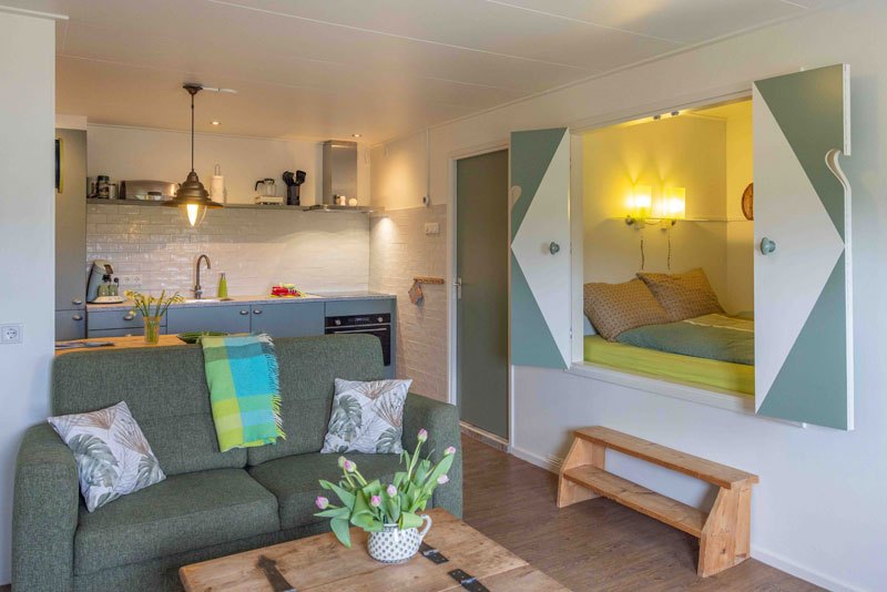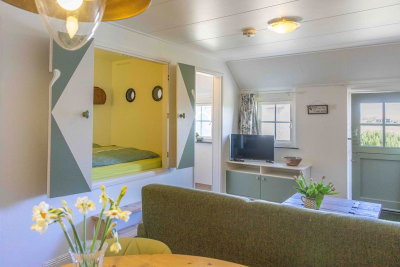 Het groene appartement is knus en romantisch. U slaapt in een bedstee.