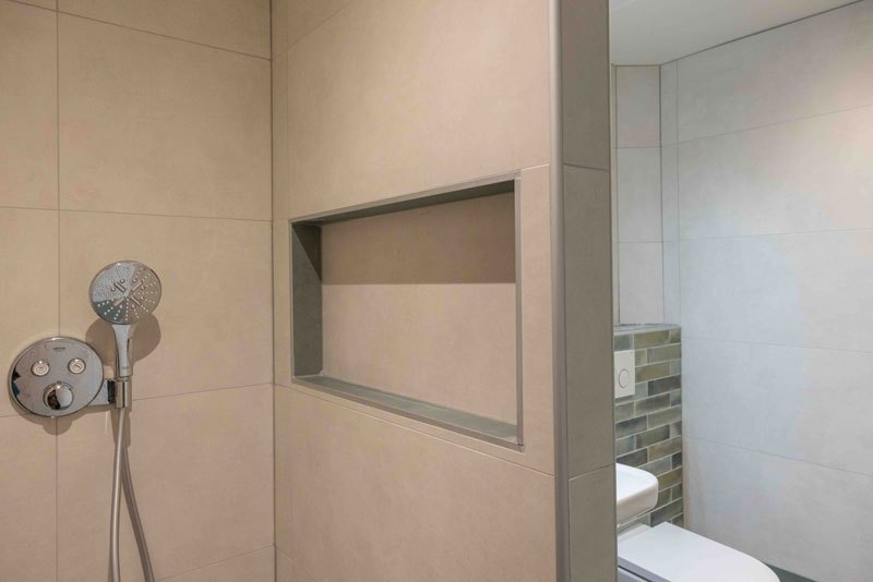 De badkamer is voorzien van een comfort-inloopdouche inclusief Stortdouche en elektrisch te bedienen vloerverwarming.
