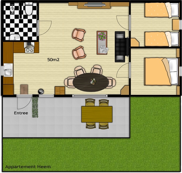 Appartement Heem is geschikt voor 4 personen en is geheel begane grond gelegen.